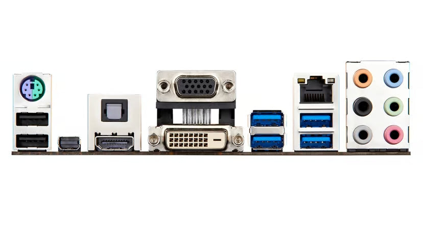1 x DisplayPort 1 x DVI-D 1 x HDMI 1 x LAN (Gigabit Ethernet) 1 x lydinnlinje - minijakk 1 x lydutlinje - minijakk 1 x lydutlinje (bakre) - minijakk 1 x lydutlinje (senter/subbasshøyttaler) - minijakk 1 x lydutlinje (side-surround) - minijakk 1 x mikrofon - minijakk 1 x PS/2-tastatur / -mus 1 x TOSLINK 1 x VGA 2 x USB 2.0 4 x USB 3.0 |