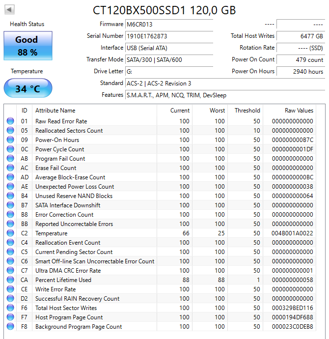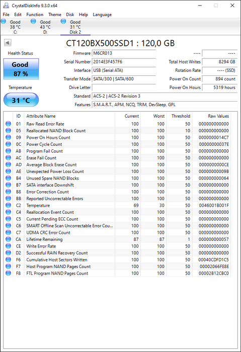 | Egenskaper | TRIM-støtte, Error Correction Code (ECC), Multistep Data Integrity Algorithm, Active Garbage Collection, 3D NAND Technology, SLC Write Acceleration, Thermal Monitoring |