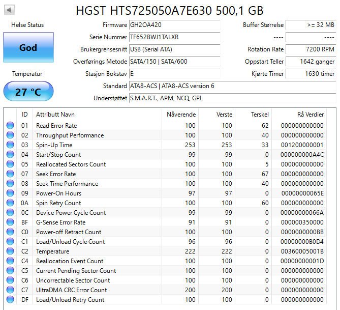 HTS725050A7E630 HGST Hitachi Travelstar Z7K500 500GB 7200RPM SATA 6Gbps 32MB Cache (512e) 2.5" HDD