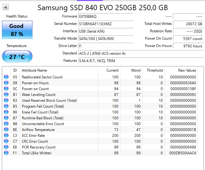 TRIM-støtte, Automatic Garbage Collection, Samsung 3-core MEX Controller, Low Power DDR2 SDRAM Cache, S.M.A.R.T., 256-bit AES |