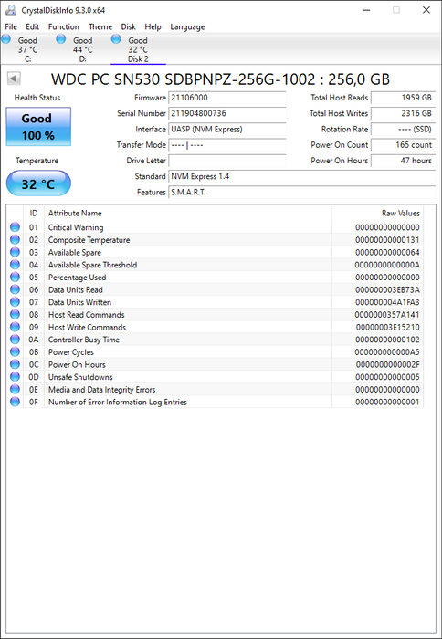SDBPNPZ-256G-1002 Western Digital 256GB SN530 M.2 NVMe SSD