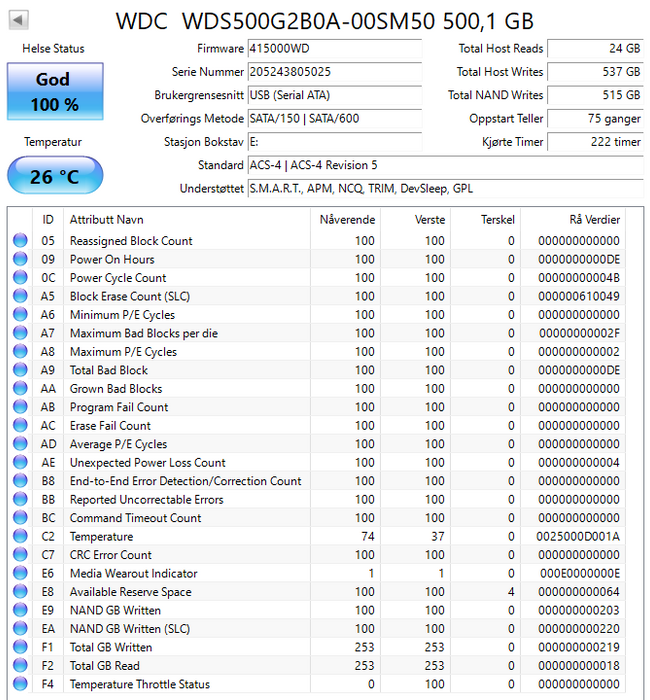 | Dataoverføringshastighet | 600 MBps (ekstern) |